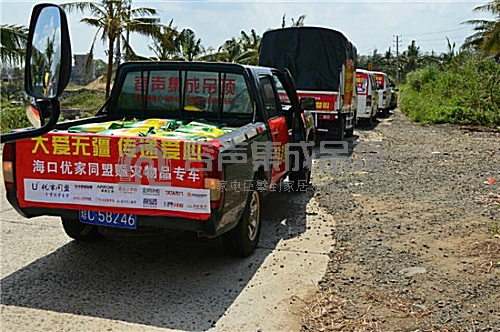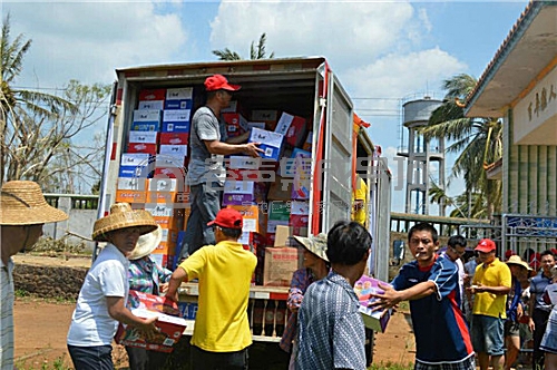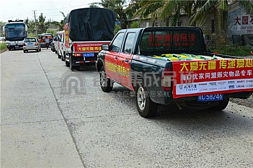 大愛無疆,傳遞愛心。由海口容聲組織的優家同盟集合了數十輛貨車裝載著大米、帳篷、方便面、礦泉水等賑災物資運往災區。