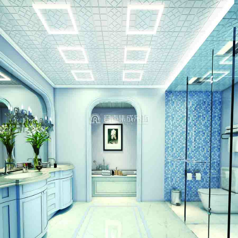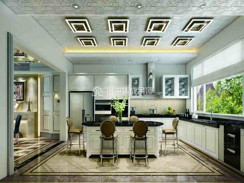 面板細線條紋與偌大的回字造型LED燈組合在一起,如凝聚了空間的生命力,形成強有力的視覺焦點;簡歐原木打造的廚房家具使整個廚衛空間形成不拘一格的布局,悠然從容。
