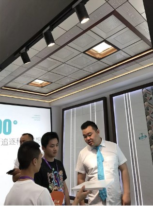 此外,“容聲超級抗污板”和“容聲香氛”系列新品融入行業先進科技。“容聲超級抗污板”采用全新超納米技術,由容聲與國家納米中心合作研發;“容聲香氛”系列,則為行業首創“香氛”系列新品,具有清新空氣、為家居空間添加怡人香氣的功能。在吊頂行業同質化現象嚴重的當下,產品創新著實難能可貴。容聲的三款創新新品讓人眼前一亮,既彰顯了容聲的創新實力和品牌實力,也吸引了會場眾多參觀者和經銷商慕名前來參觀咨詢。