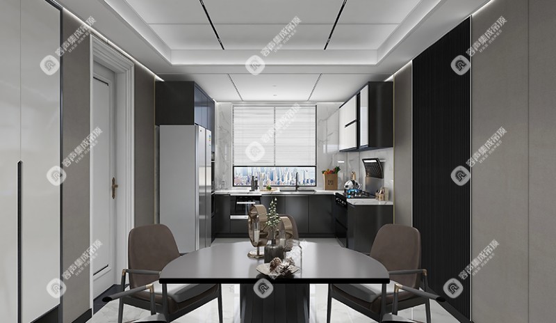 餐廳和廚房一體,款色搭配依然以簡約的黑白灰為主,干凈清爽,易于打理。