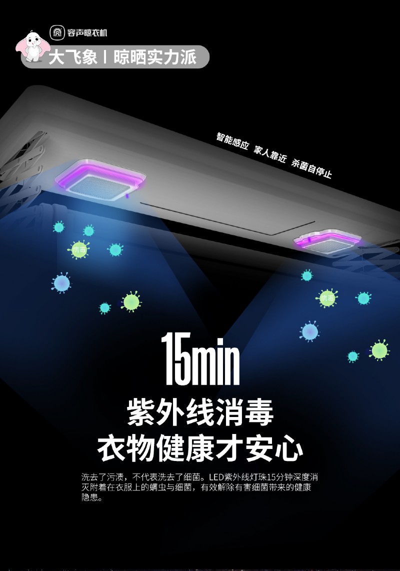 容聲大飛象高配款晾衣機配備了新升級的深紫外線殺菌燈,燈珠由中科院企業參與研發生產,能有效殺滅螨蟲、細菌、過敏源,除菌率高達99%!