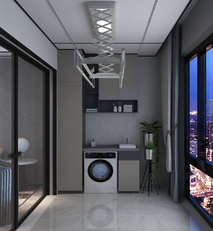 首先來說生活向的陽臺,即主要以晾曬和收納為主要功能的陽臺,這類陽臺基本是家庭使用首選,比起詩和遠方,切實的屋主們追求的是便利實用。這樣的話,陽臺設計就要以陽臺柜為主,嵌入洗衣機,增加晾衣架。
