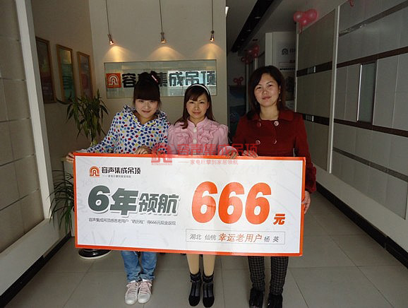 湖北仙桃楊英女士領獎,并與容聲集成吊頂工作人員合影留戀