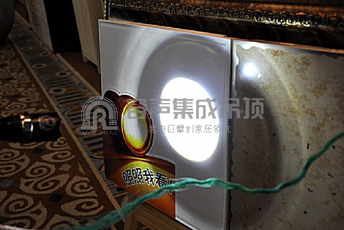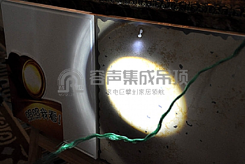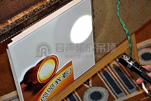 在容聲集成吊頂新品展廳,設置了專門的“金屬漆板材”展示體驗架——通過強光手電照射在容聲集成吊頂金屬漆板材和普通板材上的對比體驗,來直觀地感受金屬漆板材的優點!此款新品紛紛引得經銷商們圍觀與探討,并親自體驗感受金屬漆板材的特別表現力!